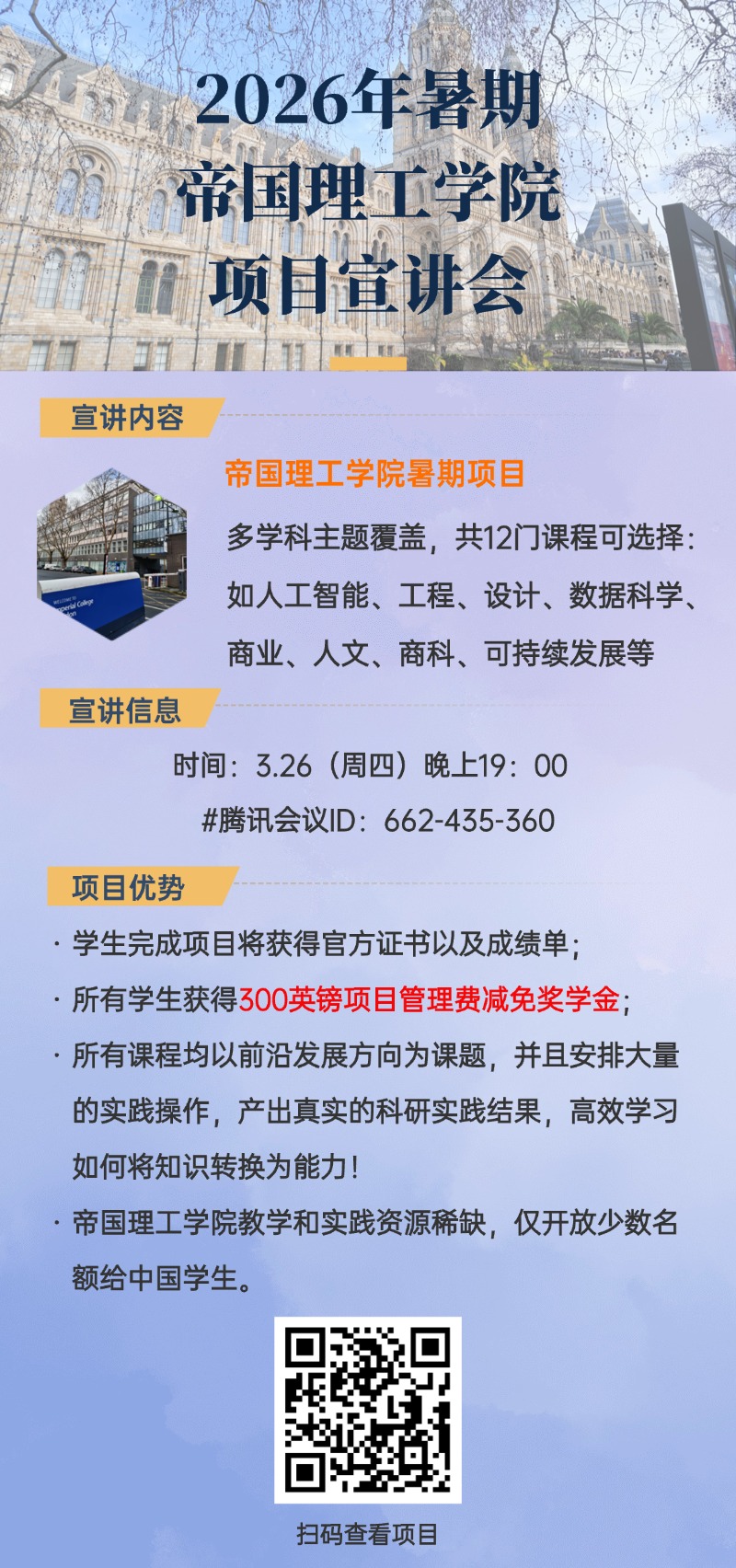 8. 人文体验:项目除涵盖专业知识,帝国理工将安排社会活动例如The Royal Albert Hall,除此同学们还可利用课余时间游览著名国际都市伦敦,可深度感受英国的多元文化与国际化氛围,拓展全球视野。具体安排根据帝国理工实际情况调整;